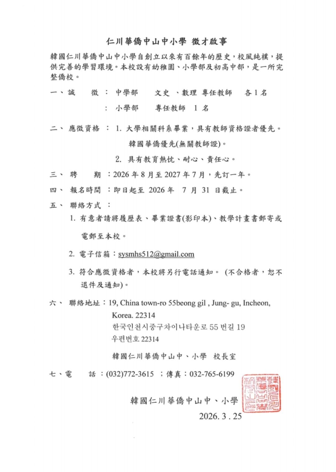 韓國仁川華僑中山中小學 公告起迄日期:2026-04-14~2026-07-31 學校網址:http://www.sysmhs.com.tw/ 檔案下載 甄選訊息 md5: dea8f04d005a4d834fcffdb1b543c8d7 分享到Facebook(另開視窗) 用LINE傳送(另開視窗) Back 點閱人數:1